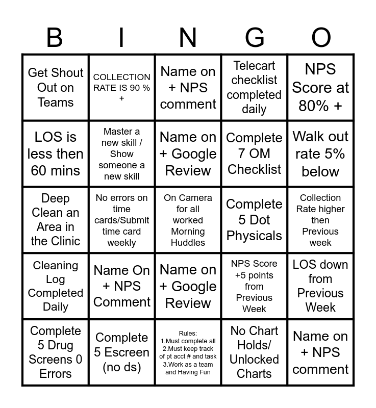 This bingo card has a free space and 24 words: Name On + NPS Comment, Complete 5 Escreen (no ds), Name on + Google Review, Complete 5 Drug Screens 0 Errors, NPS Score at 80% +, Get Shout Out on Teams, LOS is less then 60 mins, COLLECTION RATE IS 90 % +, Complete 5 Dot Physicals, Name on + Google Review, Complete 7 OM Checklist, Deep Clean an Area in the Clinic, NPS Score +5 points from Previous Week, LOS down from Previous Week, Master a new skill / Show someone a new skill, No Chart Holds/ Unlocked Charts, Collection Rate higher then Previous week, Name on + NPS comment, Walk out rate 5% below, No errors on time cards/Submit time card weekly, Name on + NPS comment, Cleaning Log Completed Daily, Telecart checklist completed daily and Rules: 1.Must complete all 2.Must keep track of pt acct # and task 3.Work as a team and Having Fun.