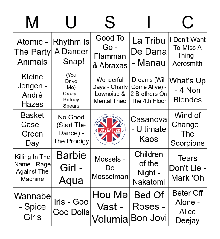 This bingo card has a free space and 24 words: Barbie Girl - Aqua, Iris - Goo Goo Dolls, Wonderful Days - Charly Lownoise & Mental Theo, Wannabe - Spice Girls, I Don't Want To Miss A Thing - Aerosmith, Atomic - The Party Animals, Kleine Jongen - André Hazes, Rhythm Is A Dancer - Snap!, Casanova - Ultimate Kaos, Mossels - De Mosselman, Dreams (Will Come Alive) - 2 Brothers On The 4th Floor, Basket Case - Green Day, Children of the Night - Nakatomi, Tears Don't Lie - Mark 'Oh, (You Drive Me) Crazy - Britney Spears, Bed Of Roses - Bon Jovi, Wind of Change - The Scorpions, Good To Go - Flamman & Abraxas, What's Up - 4 Non Blondes, No Good (Start The Dance) - The Prodigy, Beter Off Alone - Alice Deejay, Killing In The Name - Rage Against The Machine, La Tribu De Dana - Manau and Hou Me Vast - Volumia.