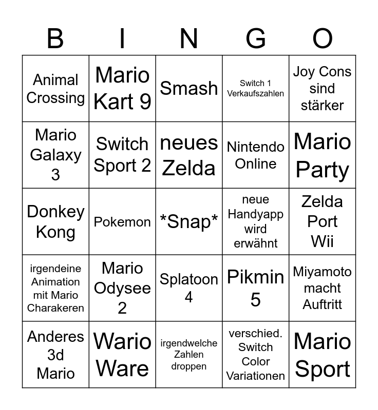 This bingo card has a free space and 24 words: Mario Odysee 2, Wario Ware, neues Zelda, Anderes 3d Mario, Joy Cons sind stärker, Animal Crossing, Mario Galaxy 3, Mario Kart 9, neue Handyapp wird erwähnt, Splatoon 4, Nintendo Online, Donkey Kong, Pikmin 5, Miyamoto macht Auftritt, Switch Sport 2, verschied. Switch Color Variationen, Zelda Port Wii, Smash, Mario Party, Pokemon, Mario Sport, irgendeine Animation mit Mario Charakeren, Switch 1 Verkaufszahlen and irgendwelche Zahlen droppen.