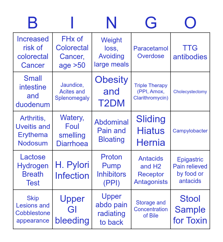 This bingo card has 25 words: H. Pylori Infection, Upper abdo pain radiating to back, Obesity and T2DM, Skip Lesions and Cobblestone appearance, TTG antibodies, Increased risk of colorectal Cancer, Small intestine and duodenum, FHx of Colorectal Cancer, age >50, Sliding Hiatus Hernia, Proton Pump Inhibitors (PPI), Triple Therapy (PPI, Amox, Clarithromycin), Arthritis, Uveitis and Erythema Nodosum, Antacids and H2 Receptor Antagonists, Epigastric Pain relieved by food or antacids, Jaundice, Acites and Splenomegaly, Stool Sample for Toxin, Campylobacter, Weight loss, Avoiding large meals, Cholecystectomy, Watery, Foul smelling Diarrhoea, Abdominal Pain and Bloating, Upper GI bleeding, Lactose Hydrogen Breath Test, Paracetamol Overdose and Storage and Concentration of Bile.