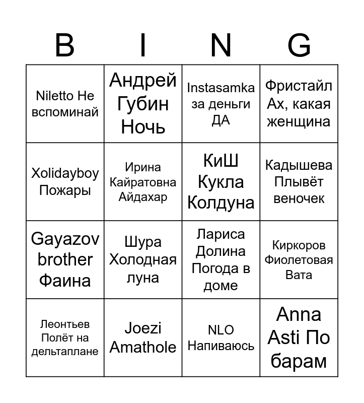 This bingo card has 18 words: Шура Холодная луна, Anna Asti По барам, Instasamka за деньги ДА, Niletto Не вспоминай, Лариса Долина Погода в доме, Фристайл Ах, какая женщина, Леонтьев Полёт на дельтаплане, Андрей Губин Ночь, Кадышева Плывёт веночек, Gayazov brother Фаина, NLO Напиваюсь, Xolidayboy Пожары, Киркоров Фиолетовая Вата, Ирина Кайратовна Айдахар, КиШ Кукла Колдуна, Мираж Новый герой, Joezi Amathole and Matrang Патриархат.