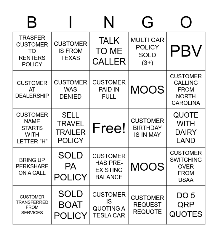 This bingo card has a free space and 24 words: SOLD PA POLICY, SOLD BOAT POLICY, CUSTOMER PAID IN FULL, CUSTOMER TRANSFERRED FROM SERVICES, PBV, TRASFER CUSTOMER TO RENTERS POLICY, CUSTOMER AT DEALERSHIP, CUSTOMER IS FROM TEXAS, CUSTOMER BIRTHDAY IS IN MAY, CUSTOMER HAS PRE-EXISTING BALANCE, MOOS, CUSTOMER NAME STARTS WITH LETTER "H", MOOS, CUSTOMER SWITCHING OVER FROM USAA, CUSTOMER WAS DENIED, CUSTOMER REQUEST REQUOTE, QUOTE WITH DAIRY LAND, TALK TO ME CALLER, CUSTOMER CALLING FROM NORTH CAROLINA, SELL TRAVEL TRAILER POLICY, DO 5 QRP QUOTES, BRING UP PERKSHARE ON A CALL, MULTI CAR POLICY SOLD (3+) and CUSTOMER IS QUOTING A TESLA CAR.