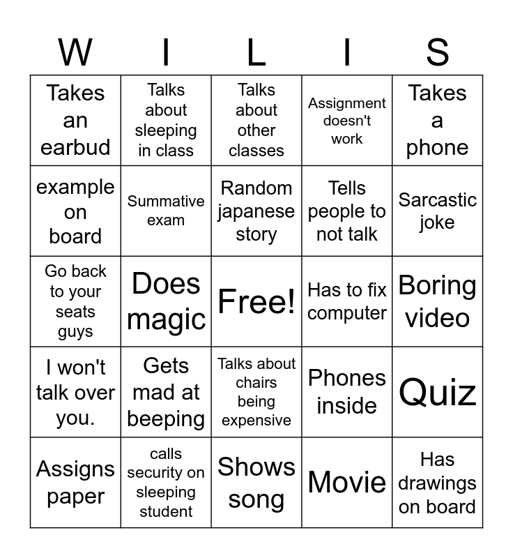 This bingo card has a free space and 24 words: Gets mad at beeping, calls security on sleeping student, Random japanese story, Assigns paper, Takes a phone, Takes an earbud, example on board, Talks about sleeping in class, Has to fix computer, Talks about chairs being expensive, Tells people to not talk, Go back to your seats guys, Phones inside, Quiz, Summative exam, Movie, Boring video, Talks about other classes, Sarcastic joke, Does magic, Has drawings on board, I won't talk over you., Assignment doesn't work and Shows song.