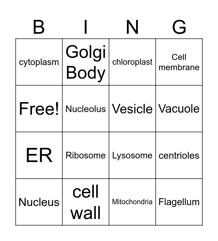 This bingo card has 16 words: cell wall, centrioles, chloroplast, cytoplasm, ER, Golgi Body, Lysosome, Mitochondria, Free!, Nucleolus, Nucleus, Cell membrane, Ribosome, Vacuole, Vesicle and Flagellum.