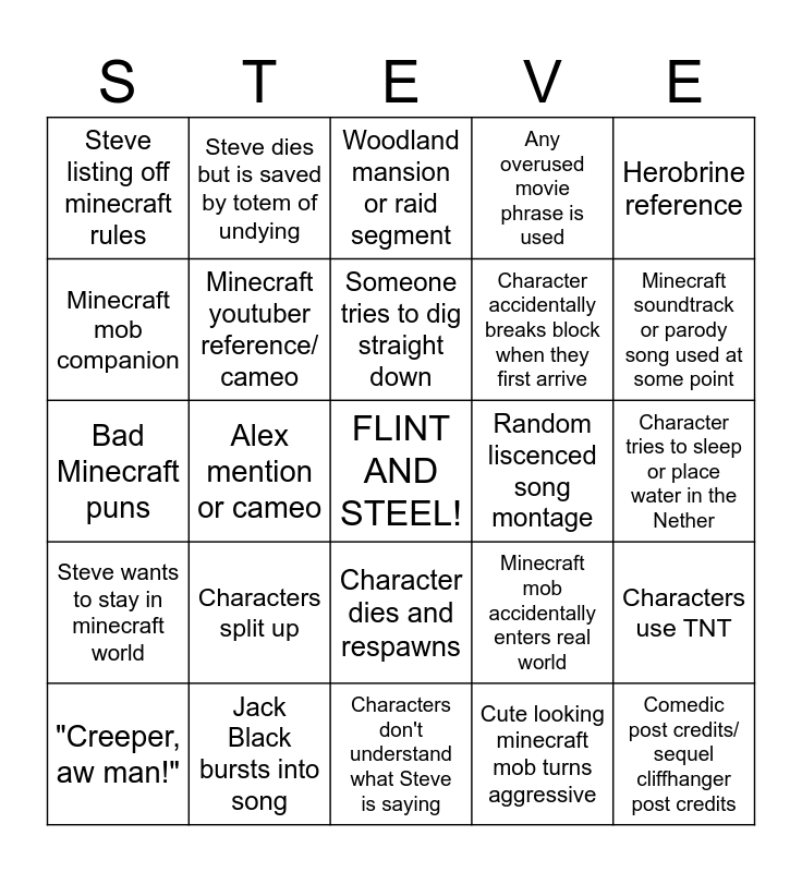 This bingo card has a free space and 24 words: Characters split up, Jack Black bursts into song, Someone tries to dig straight down, "Creeper, aw man!", Herobrine reference, Steve listing off minecraft rules, Minecraft mob companion, Steve dies but is saved by totem of undying, Random liscenced song montage, Character dies and respawns, Character accidentally breaks block when they first arrive, Bad Minecraft puns, Minecraft mob accidentally enters real world, Characters use TNT, Minecraft youtuber reference/ cameo, Cute looking minecraft mob turns aggressive, Character tries to sleep or place water in the Nether, Woodland mansion or raid segment, Minecraft soundtrack or parody song used at some point, Alex mention or cameo, Comedic post credits/ sequel cliffhanger post credits, Steve wants to stay in minecraft world, Any overused movie phrase is used and Characters don't understand what Steve is saying.