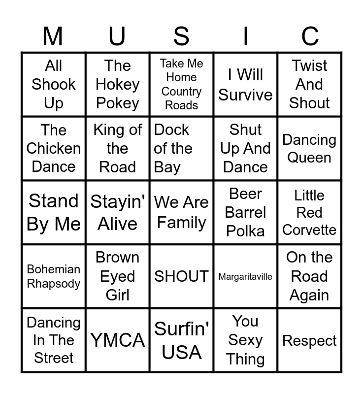 This bingo card has 25 words: Brown Eyed Girl, Surfin' USA, Dock of the Bay, Dancing In The Street, Twist And Shout, All Shook Up, The Chicken Dance, The Hokey Pokey, Beer Barrel Polka, SHOUT, Shut Up And Dance, Stand By Me, Margaritaville, On the Road Again, King of the Road, Respect, Little Red Corvette, Take Me Home Country Roads, Dancing Queen, Stayin' Alive, We Are Family, YMCA, Bohemian Rhapsody, I Will Survive and You Sexy Thing.