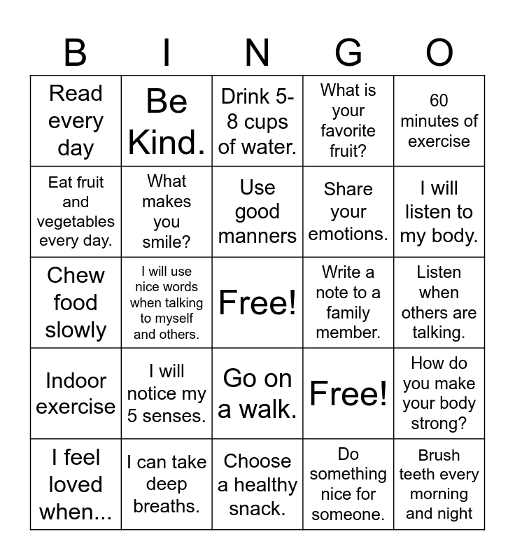 This bingo card has a free space and 25 words: I will notice my 5 senses., Choose a healthy snack., Use good manners, I feel loved when..., 60 minutes of exercise, Read every day, Eat fruit and vegetables every day., Be Kind., Write a note to a family member., Go on a walk., Share your emotions., Chew food slowly, Free!, How do you make your body strong?, What makes you smile?, Try a new food., Listen when others are talking., Drink 5-8 cups of water., I will listen to my body., I will use nice words when talking to myself and others., Brush teeth every morning and night, I can take deep breaths., Indoor exercise, What is your favorite fruit? and Do something nice for someone..