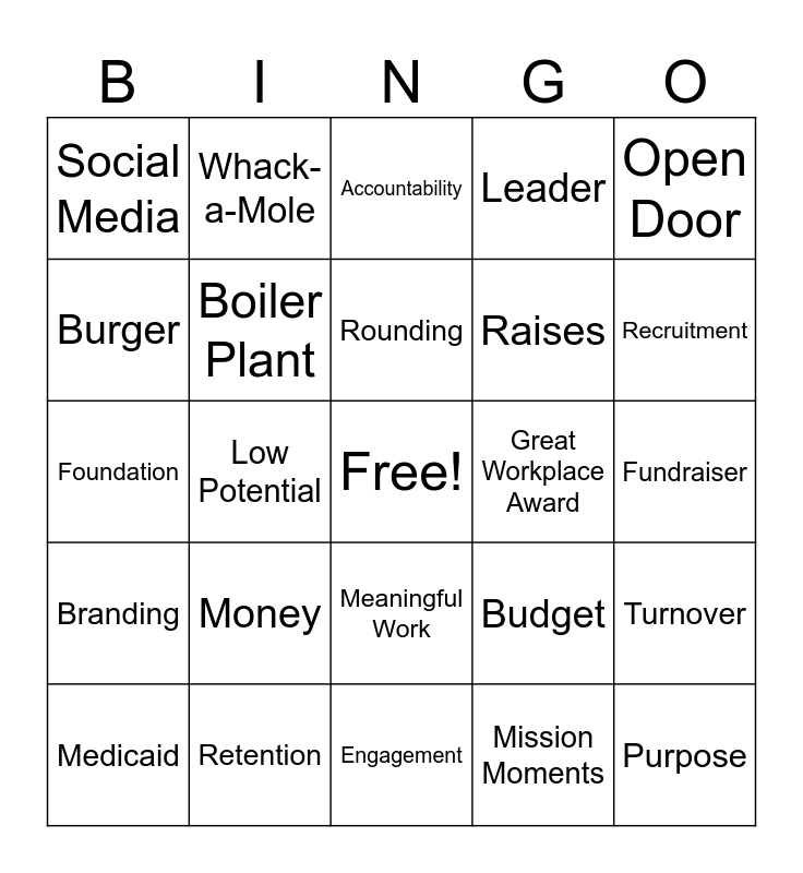 This bingo card has a free space and 27 words: Budget, St. Elsewhere, Raises, Engagement, Burger, Accountability, Whack-a-Mole, Branding, Great Workplace Award, Turnover, Foundation, Leader, Medicaid, Retention, Recruitment, Cardiology, Boiler Plant, Rounding, Money, Social Media, Fundraiser, Mission Moments, Low Potential, Purpose, Meaningful Work, Open Door and Visibility.