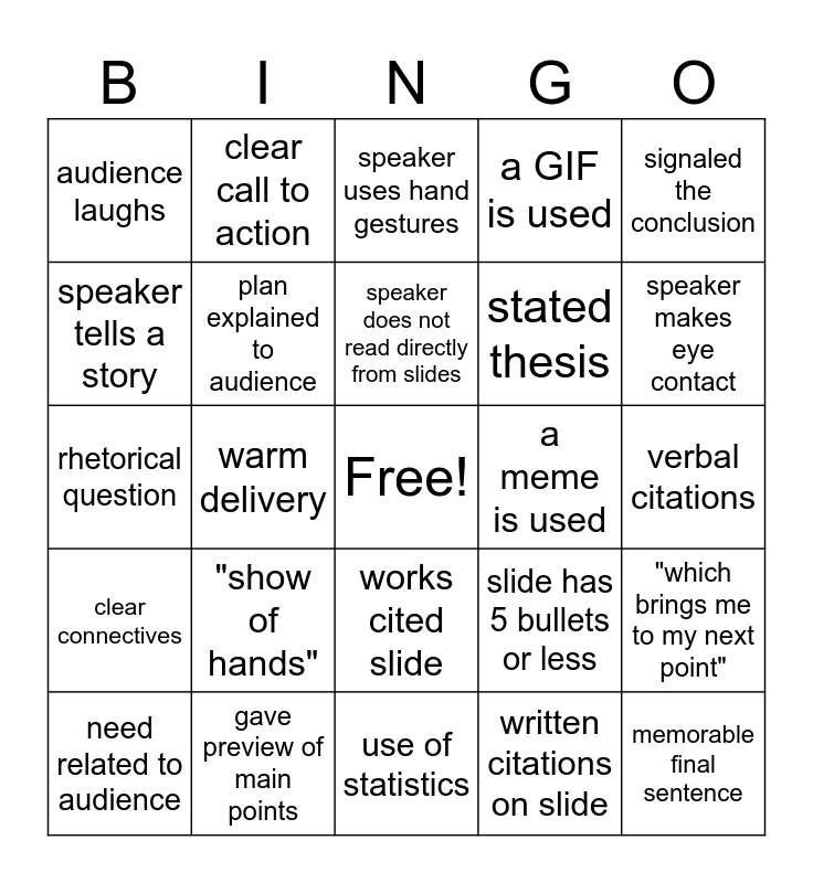 This bingo card has a free space and 24 words: "show of hands", gave preview of main points, speaker does not read directly from slides, need related to audience, signaled the conclusion, audience laughs, speaker tells a story, clear call to action, a meme is used, works cited slide, stated thesis, rhetorical question, slide has 5 bullets or less, "which brings me to my next point", plan explained to audience, written citations on slide, verbal citations, speaker uses hand gestures, speaker makes eye contact, warm delivery, memorable final sentence, clear connectives, a GIF is used and use of statistics.