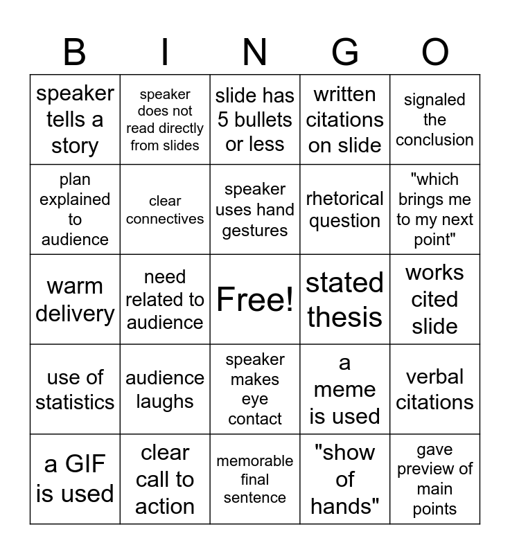This bingo card has a free space and 24 words: audience laughs, clear call to action, speaker uses hand gestures, a GIF is used, signaled the conclusion, speaker tells a story, plan explained to audience, speaker does not read directly from slides, stated thesis, speaker makes eye contact, rhetorical question, warm delivery, a meme is used, verbal citations, clear connectives, "show of hands", works cited slide, slide has 5 bullets or less, "which brings me to my next point", need related to audience, gave preview of main points, use of statistics, written citations on slide and memorable final sentence.