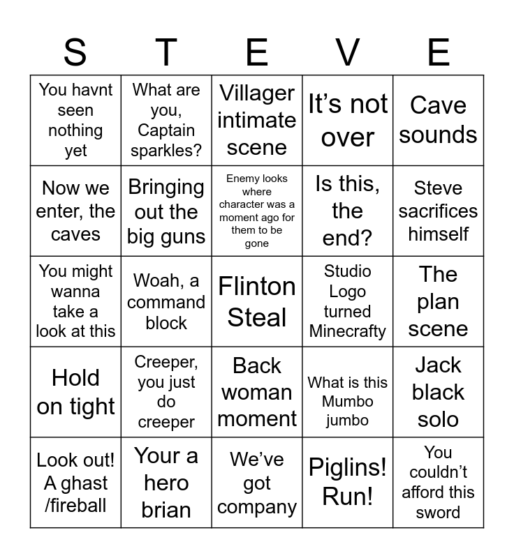 This bingo card has a free space and 24 words: Creeper, you just do creeper, Your a hero brian, Enemy looks where character was a moment ago for them to be gone, Look out! A ghast /fireball, Cave sounds, You havnt seen nothing yet, Now we enter, the caves, What are you, Captain sparkles?, Studio Logo turned Minecrafty, Back woman moment, Is this, the end?, You might wanna take a look at this, What is this Mumbo jumbo, Jack black solo, Bringing out the big guns, Piglins! Run!, The plan scene, Villager intimate scene, Steve sacrifices himself, Woah, a command block, You couldn’t afford this sword, Hold on tight, It’s not over and We’ve got company.