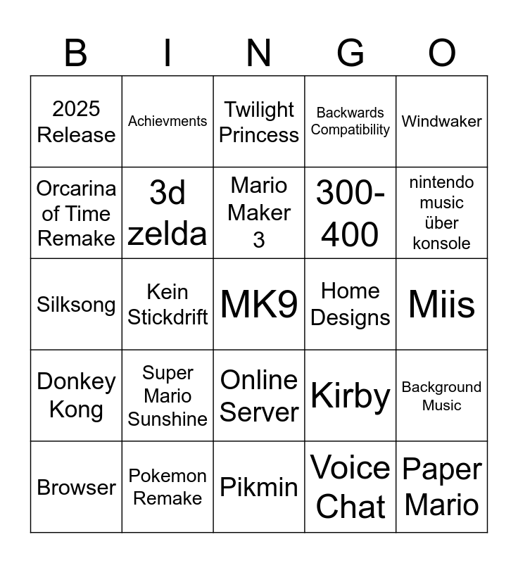 This bingo card has a free space and 24 words: Super Mario Sunshine, Pokemon Remake, Mario Maker 3, Browser, Windwaker, 2025 Release, Orcarina of Time Remake, Achievments, Home Designs, Online Server, 300-400, Silksong, Kirby, Background Music, 3d zelda, Voice Chat, Miis, Twilight Princess, nintendo music über konsole, Kein Stickdrift, Paper Mario, Donkey Kong, Backwards Compatibility and Pikmin.