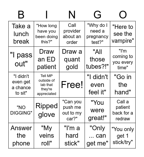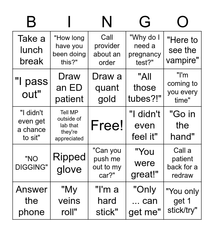 This bingo card has a free space and 29 words: Answer the phone, Hi-five a fellow MP, Tell MP outside of lab that they're appreciated, You're put on hold, Take a lunch break, Call provider about an order, Draw an ED patient, Ripped glove, "I didn't even feel it", "My veins roll", "Go in the hand", "You only get 1 stick/try", "I'm a hard stick", "Only ... can get me", "I'm coming to you every time", "You have to use a butterfly on me", "Can you push me out to my car?", "NO DIGGING", "Here to see the vampire", "I didn't even get a chance to sit", "You were great!", "I have horrible veins", "All those tubes?!", "I pass out", "Why do I need a pregnancy test?", "How long have you been doing this?", Call a patient back for a redraw, Draw a quant gold and Draw/witness a type and screen.