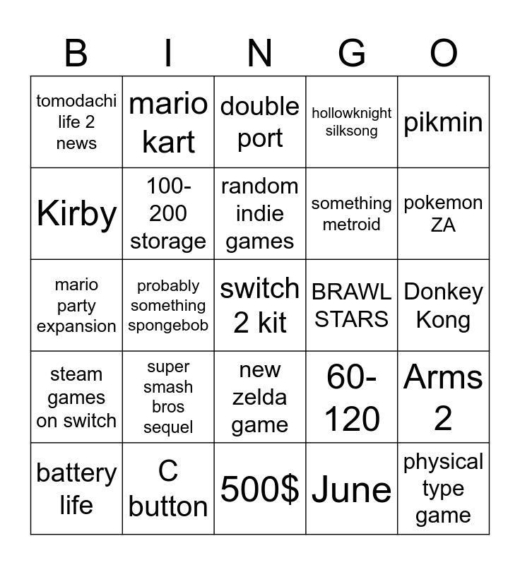 This bingo card has a free space and 24 words: super smash bros sequel, C button, random indie games, battery life, pikmin, tomodachi life 2 news, Kirby, mario kart, BRAWL STARS, new zelda game, something metroid, mario party expansion, 60-120, Arms 2, 100-200 storage, June, Donkey Kong, double port, pokemon ZA, probably something spongebob, physical type game, steam games on switch, hollowknight silksong and 500$.