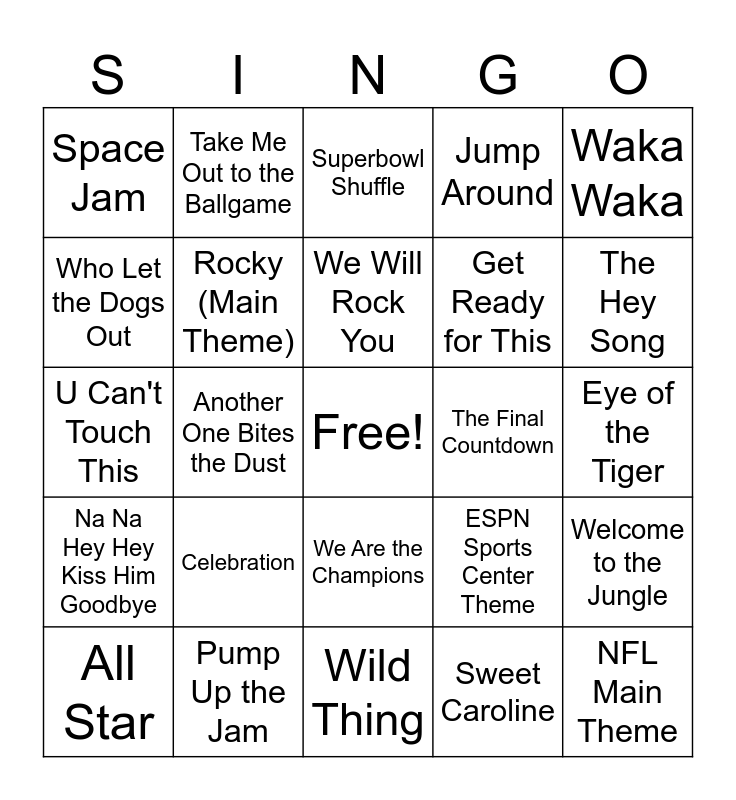 This bingo card has a free space and 24 words: All Star, Celebration, We Will Rock You, Sweet Caroline, Waka Waka, Space Jam, Take Me Out to the Ballgame, Superbowl Shuffle, The Final Countdown, Eye of the Tiger, U Can't Touch This, Rocky (Main Theme), ESPN Sports Center Theme, Welcome to the Jungle, Who Let the Dogs Out, Pump Up the Jam, Wild Thing, Jump Around, The Hey Song, Na Na Hey Hey Kiss Him Goodbye, Another One Bites the Dust, We Are the Champions, Get Ready for This and NFL Main Theme.
