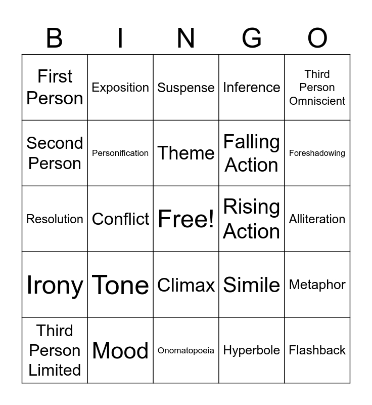 This bingo card has a free space and 24 words: Tone, Mood, Theme, Third Person Limited, Third Person Omniscient, First Person, Second Person, Exposition, Rising Action, Climax, Falling Action, Resolution, Simile, Metaphor, Personification, Hyperbole, Alliteration, Suspense, Foreshadowing, Conflict, Flashback, Irony, Inference and Onomatopoeia.