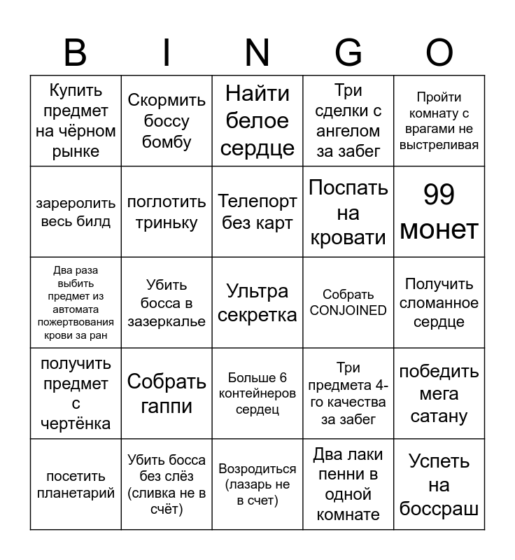 This bingo card has 25 words: Собрать гаппи, Возродиться (лазарь не в счет), Телепорт без карт, посетить планетарий, Пройти комнату с врагами не выстреливая, Купить предмет на чёрном рынке, зареролить весь билд, Скормить боссу бомбу, Собрать CONJOINED, Больше 6 контейнеров сердец, Поспать на кровати, Два раза выбить предмет из автомата пожертвования крови за ран, Три предмета 4-го качества за забег, победить мега сатану, поглотить триньку, Успеть на боссраш, Получить сломанное сердце, Найти белое сердце, 99 монет, Убить босса в зазеркалье, Ультра секретка, Убить босса без слёз (сливка не в счёт), получить предмет с чертёнка, Три сделки с ангелом за забег and Два лаки пенни в одной комнате.