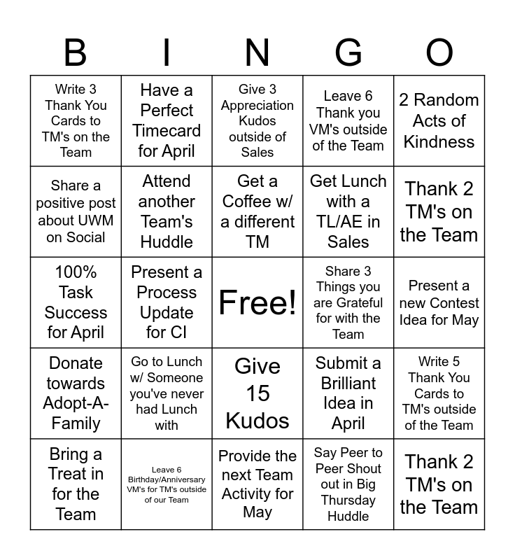 This bingo card has a free space and 24 words: Go to Lunch w/ Someone you've never had Lunch with, Leave 6 Birthday/Anniversary VM's for TM's outside of our Team, Get a Coffee w/ a different TM, Bring a Treat in for the Team, 2 Random Acts of Kindness, Write 3 Thank You Cards to TM's on the Team, Share a positive post about UWM on Social, Have a Perfect Timecard for April, Share 3 Things you are Grateful for with the Team, Give 15 Kudos, Get Lunch with a TL/AE in Sales, 100% Task Success for April, Submit a Brilliant Idea in April, Write 5 Thank You Cards to TM's outside of the Team, Attend another Team's Huddle, Say Peer to Peer Shout out in Big Thursday Huddle, Present a new Contest Idea for May, Give 3 Appreciation Kudos outside of Sales, Thank 2 TM's on the Team, Present a Process Update for CI, Thank 2 TM's on the Team, Donate towards Adopt-A-Family, Leave 6 Thank you VM's outside of the Team and Provide the next Team Activity for May.