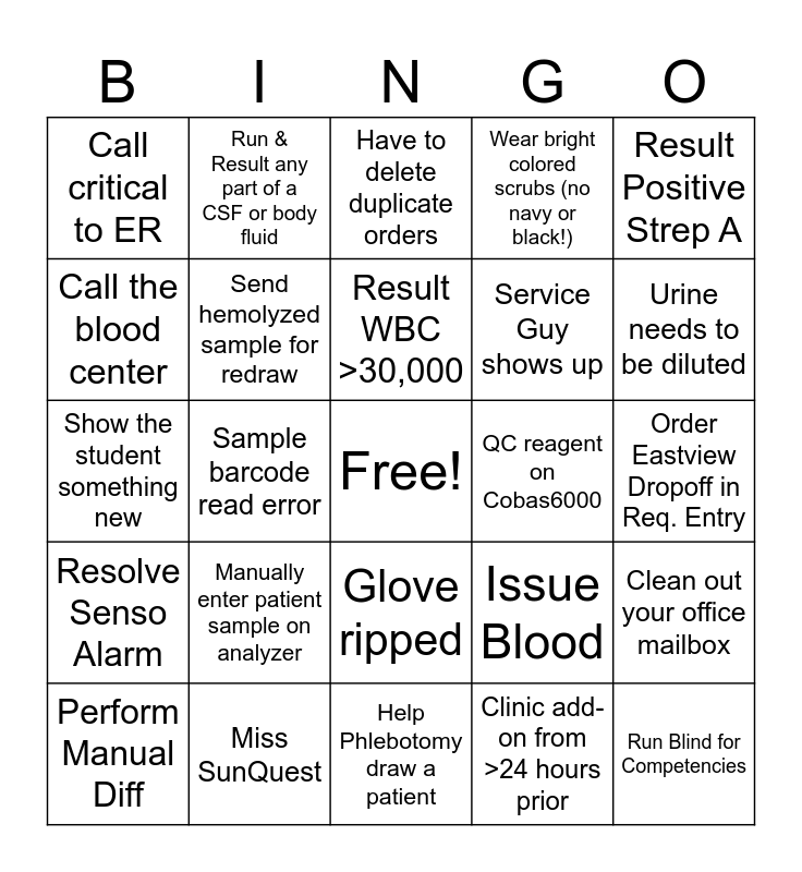 This bingo card has a free space and 31 words: Help Phlebotomy draw a patient, Positive Blood Culture, Sample barcode read error, Have to collect sample while receiving, Call critical to ER, Have to delete duplicate orders, Send hemolyzed sample for redraw, Issue Blood, QC reagent on Cobas6000, Clinic add-on from >24 hours prior, Order Eastview Dropoff in Req. Entry, Run Blind for Competencies, Pos. CDiff - Run CGtab, Run and result ETOH on patient that legally can't drive, Urine needs to be diluted, Empty recycle bins, Clean out your office mailbox, Manually enter patient sample on analyzer, Resolve Senso Alarm, Glove ripped, Result Positive Strep A, Reject clotted CBC, Perform Manual Diff, Run & Result any part of a CSF or body fluid, Service Guy shows up, Call the blood center, Wear bright colored scrubs (no navy or black!), Show the student something new, Miss SunQuest, Result WBC >30,000 and Use the microscope for a patient test.