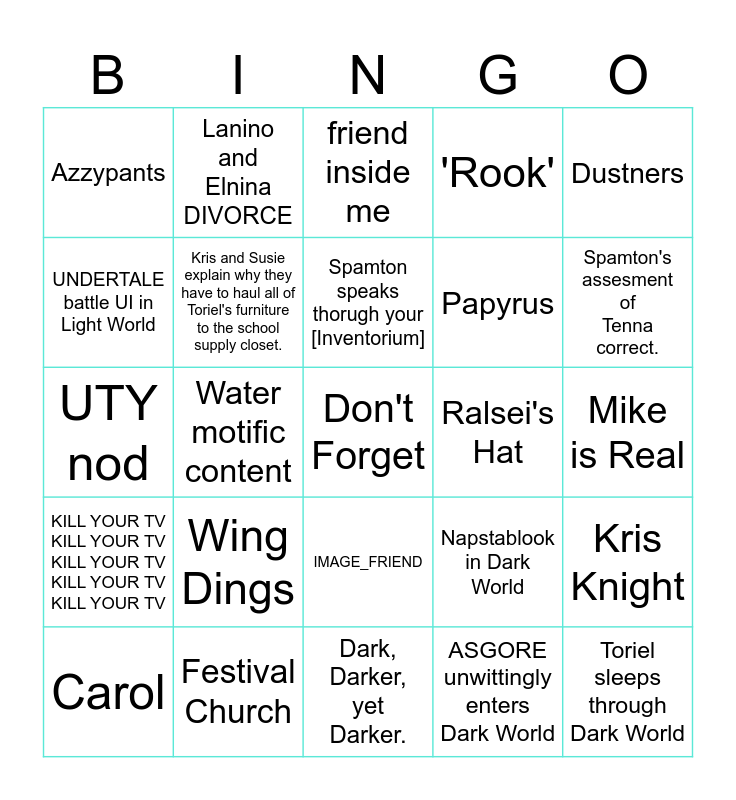 This bingo card has a free space and 24 words: Carol, Wing Dings, Spamton speaks thorugh your [Inventorium], ASGORE unwittingly enters Dark World, Dustners, Azzypants, Lanino and Elnina DIVORCE, friend inside me, Ralsei's Hat, Mike is Real, UTY nod, Kris and Susie explain why they have to haul all of Toriel's furniture to the school supply closet., Napstablook in Dark World, Kris Knight, UNDERTALE battle UI in Light World, Festival Church, Dark, Darker, yet Darker., 'Rook', Spamton's assesment of Tenna correct., KILL YOUR TV KILL YOUR TV KILL YOUR TV KILL YOUR TV KILL YOUR TV, Water motific content, IMAGE_FRIEND, Papyrus and Toriel sleeps through Dark World.
