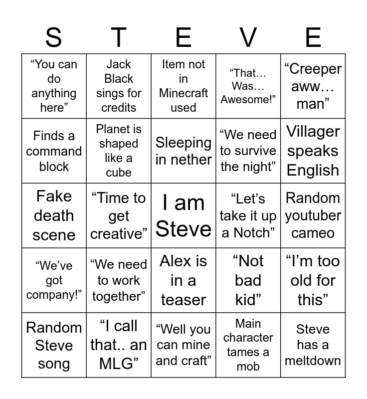 This bingo card has a free space and 29 words: Random Steve song, Someone finds diamonds, “Time to get creative”, Montage starts, “You can do anything here”, Item not in Minecraft used, Planet is shaped like a cube, “We need to work together”, “Let’s take it up a Notch”, “I call that.. an MLG”, Random youtuber cameo, Steve has a meltdown, “Well you can mine and craft”, Main character tames a mob, Villager speaks English, Song about how to play, Alex is in a teaser, “We’ve got company!”, “Creeper aww…man”, Fake death scene, “Not bad kid”, “That wasn’t supposed to happen”, “We need to survive the night”, Finds a command block, “That… Was… Awesome!”, Jack Black sings for credits, “I’m too old for this”, Sleeping in nether and Looks Enderman in the eyes.