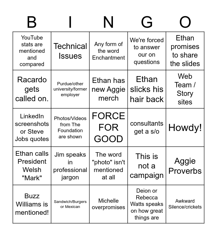 This bingo card has a free space and 24 words: Jim speaks in professional jargon, Sandwich/Burgers or Mexican, Ethan has new Aggie merch, Buzz Williams is mentioned!, Ethan promises to share the slides, YouTube stats are mentioned and compared, Racardo gets called on., Technical Issues, consultants get a s/o, The word "photo" isn't mentioned at all, Ethan slicks his hair back, LinkedIn screenshots or Steve Jobs quotes, This is not a campaign, Aggie Proverbs, Purdue/other university/former employer, Deion or Rebecca Watts speaks on how great things are, Howdy!, Any form of the word Enchantment, Web Team / Story sites, Photos/Videos from The Foundation are shown, Awkward Silence/crickets, Ethan calls President Welsh "Mark", We're forced to answer our on questions and Michelle overpromises.