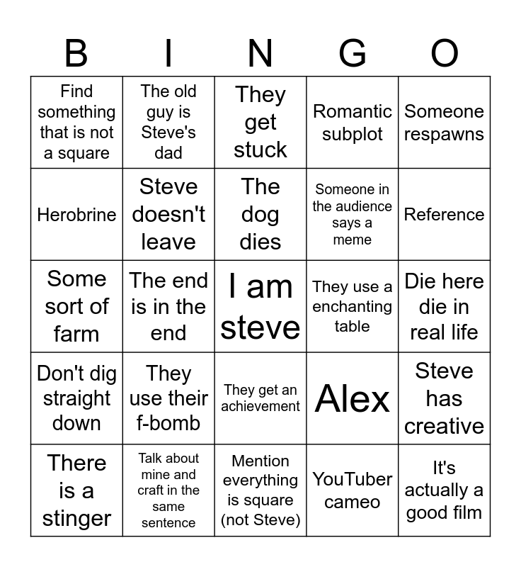 This bingo card has a free space and 24 words: They use their f-bomb, Talk about mine and craft in the same sentence, The dog dies, There is a stinger, Someone respawns, Find something that is not a square, Herobrine, The old guy is Steve's dad, They use a enchanting table, They get an achievement, Someone in the audience says a meme, Some sort of farm, Alex, Steve has creative, Steve doesn't leave, YouTuber cameo, Die here die in real life, They get stuck, Reference, The end is in the end, It's actually a good film, Don't dig straight down, Romantic subplot and Mention everything is square (not Steve).