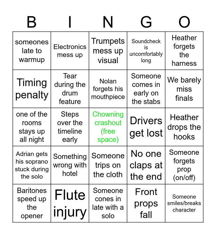This bingo card has a free space and 24 words: Something wrong with hotel, Flute injury, Nolan forgets his mouthpiece, Baritones speed up the opener, Heather forgets the harness, someones late to warmup, Timing penalty, Electronics mess up, Drivers get lost, Someone trips on the cloth, Someone comes in early on the stabs, one of the rooms stays up all night, No one claps at the end, Someone forgets prop (on/off), Tear during the drum feature, Front props fall, Heather drops the hooks, Trumpets mess up visual, We barely miss finals, Steps over the timeline early, Someone smiles/breaks character, Adrian gets his soprano stuck during the solo, Soundcheck is uncomfortably long and Someone cones in late with a solo.