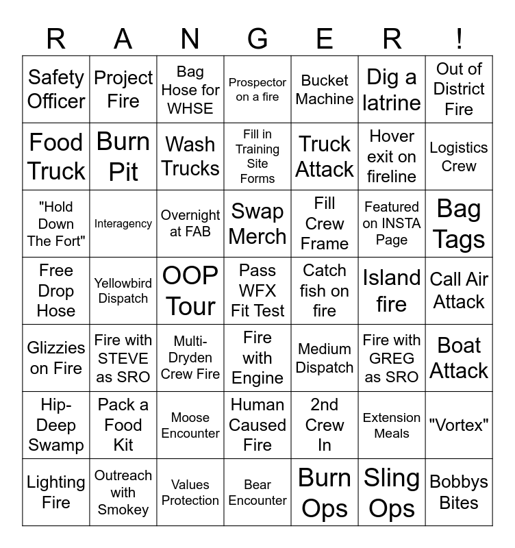 This bingo card has a free space and 48 words: 2nd Crew In, Hover exit on fireline, Bear Encounter, Yellowbird Dispatch, Overnight at FAB, Call Air Attack, Project Fire, Outreach with Smokey, Dig a latrine, Fire with Engine, Out of District Fire, Prospector on a fire, Featured on INSTA Page, Fill Crew Frame, Hip- Deep Swamp, Island fire, Food Truck, Logistics Crew, Extension Meals, Bucket Machine, Truck Attack, OOP Tour, Safety Officer, Burn Pit, "Vortex", Wash Trucks, Bag Tags, Lighting Fire, Swap Merch, Interagency, Sling Ops, Catch fish on fire, Boat Attack, Pack a Food Kit, Free Drop Hose, Medium Dispatch, Fire with GREG as SRO, "Hold Down The Fort", Multi-Dryden Crew Fire, Moose Encounter, Glizzies on Fire, Bobbys Bites, Bag Hose for WHSE, Values Protection, Fill in Training Site Forms, Human Caused Fire, Fire with STEVE as SRO and Burn Ops.