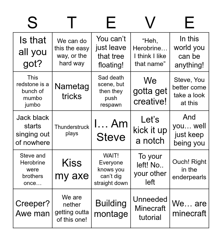 This bingo card has a free space and 24 words: Kiss my axe, We are nether getting outta of this one!, Sad death scene, but then they push respawn, Creeper? Awe man, In this world you can be anything!, Is that all you got?, This redstone is a bunch of mumbo jumbo, We can do this the easy way, or the hard way, Let’s kick it up a notch, WAIT! Everyone knows you can’t dig straight down, We gotta get creative!, Jack black starts singing out of nowhere, To your left! No.. your other left, Ouch! Right in the enderpearls, Nametag tricks, Unneeded Minecraft tutorial, And you… well just keep being you, You can’t just leave that tree floating!, Steve, You better come take a look at this, Thunderstruck plays, We… are minecraft, Steve and Herobrine were brothers once…, “Heh, Herobrine… I think I like that name” and Building montage.