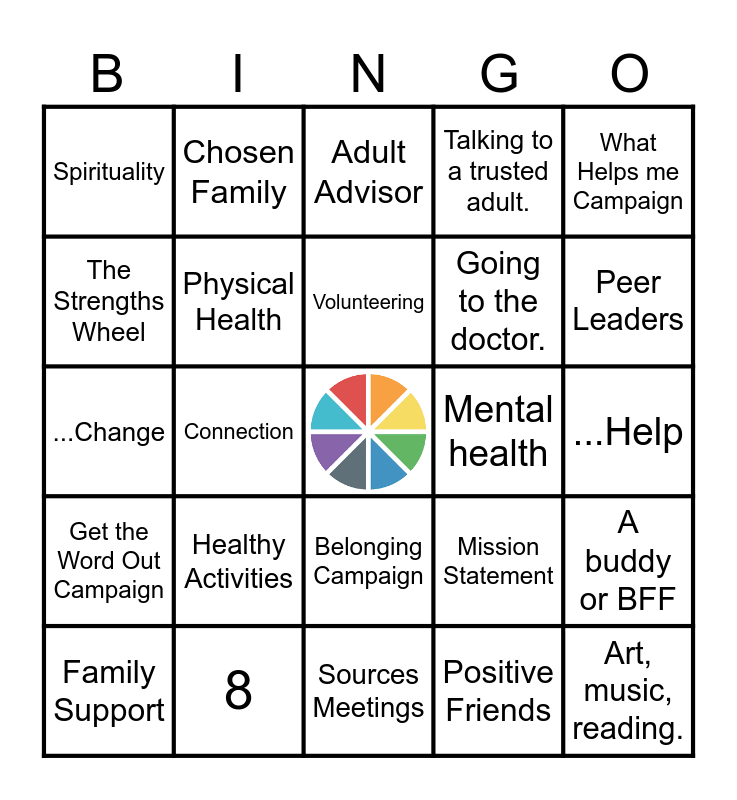This bingo card has a free space and 29 words: Family Support, Generosity, Connection, Mentors, Spirituality, Adult Advisor, Physical Health, Healthy Activities, Mental health, 8, ...Help, Art, music, reading., Sources Meetings, Positive Friends, Peer Leaders, The Big 3 Emotions, Belonging Campaign, Get the Word Out Campaign, What Helps me Campaign, ...Change, Mission Statement, ...Strength, Going to the doctor., The Strengths Wheel, Talking to a trusted adult., Chosen Family, A buddy or BFF, Volunteering and Going to church or being in nature..
