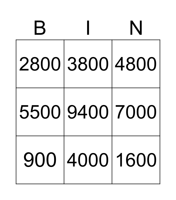 This bingo card has 14 words: Free!, 9600, 900, 3800, 5500, 9400, 1600, 6100, 4000, 2800, 1000, 7000, 4800 and 8100.