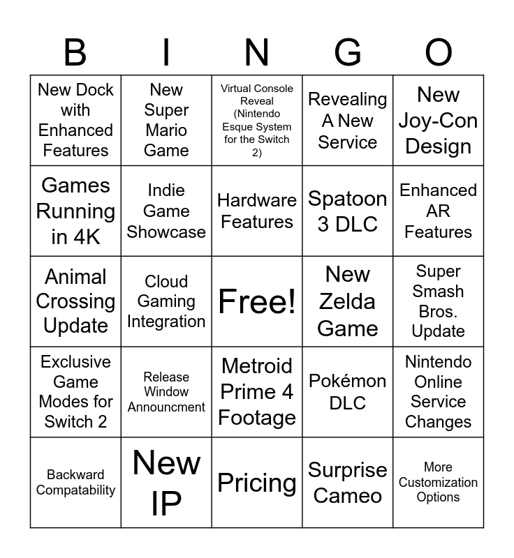 This bingo card has a free space and 25 words: Release Window Announcment, Pricing, Hardware Features, Backward Compatability, New Joy-Con Design, New Dock with Enhanced Features, Games Running in 4K, New Super Mario Game, New Zelda Game, Metroid Prime 4 Footage, Spatoon 3 DLC, Animal Crossing Update, Pokémon DLC, Nintendo Online Service Changes, Indie Game Showcase, New Third-Party Games, Super Smash Bros. Update, Virtual Console Reveal (Nintendo Esque System for the Switch 2), Enhanced AR Features, Cloud Gaming Integration, More Customization Options, New IP, Exclusive Game Modes for Switch 2, Revealing A New Service and Surprise Cameo.