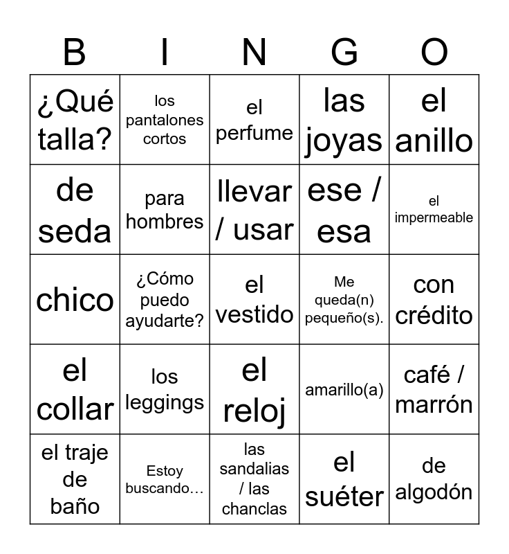 This bingo card has 101 words: ¡LIBRE!, el abrigo, el anillo, los aretes, la blusa, *la bolsa, las botas, la bufanda, los calcetines, la camisa, la camiseta, la cartera, el cinturón, el conjunto, el chaleco, la chaqueta, el collar, la colonia, la corbata, el corbatín, la falda, las gafas (de sol), el gorro, la gorra, los guantes, el impermeable, las joyas, los leggings, los jeans / vaqueros, los pantalones, los pantalones cortos, el perfume, las perlas, los pijamas, la pulsera, el reloj, la ropa interior, el sombrero, el suéter, las sandalias / las chanclas, el traje, el traje de baño, la sudadera, la sudadera con capucha, el uniforme, el vestido, los zapatos, los zapatos bajos, los zapatos de tacón (los tacones), de algodón, de cuero, de seda, de lana, de oro, de plata, de bolitas, de rayas, de cuadras, sin mangas, para mujeres, para hombres, barato(a), caro(a), este / esta, estos / estas, ese / esa, esos / esas, ¿Cómo puedo ayudarte?, Estoy buscando…, ¿Cuánto cuesta(n)?, Cuesta(n)..., ¡Es una ganga!, ¿Qué talla?, ¿Qué número?, llevar / usar, chico, mediano, grande, ¿Cómo te queda(n)?, Me queda(n) bien., Me queda(n) grande(s)., Me queda(n) flojo(s)., Me queda(n) pequeño(s)., Me queda(n) apretado(s)., ¿Cómo vas a pagar?, Pago…, con crédito, en efectivo, rojo(a), anaranjado(a), amarillo(a), verde, azul, morado(a), rosado(a), café / marrón, negro(a), blanco(a), gris, ___ claro(a) and ___ oscuro(a).