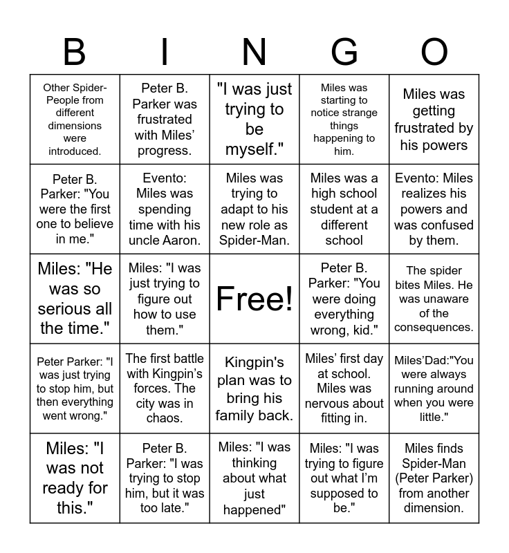 This bingo card has a free space and 24 words: The first battle with Kingpin’s forces. The city was in chaos., Peter B. Parker: "I was trying to stop him, but it was too late.", Miles was trying to adapt to his new role as Spider-Man., Miles: "I was not ready for this.", Miles was getting frustrated by his powers, Other Spider-People from different dimensions were introduced., Peter B. Parker: "You were the first one to believe in me.", Peter B. Parker was frustrated with Miles’ progress., Peter B. Parker: "You were doing everything wrong, kid.", Kingpin's plan was to bring his family back., Miles was a high school student at a different school, Miles: "He was so serious all the time.", Miles’ first day at school. Miles was nervous about fitting in., Miles’Dad:"You were always running around when you were little.", Evento: Miles was spending time with his uncle Aaron., Miles: "I was trying to figure out what I’m supposed to be.", The spider bites Miles. He was unaware of the consequences., "I was just trying to be myself.", Evento: Miles realizes his powers and was confused by them., Miles: "I was just trying to figure out how to use them.", Miles finds Spider-Man (Peter Parker) from another dimension., Peter Parker: "I was just trying to stop him, but then everything went wrong.", Miles was starting to notice strange things happening to him. and Miles: "I was thinking about what just happened".