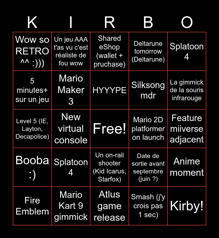 This bingo card has a free space and 24 words: Splatoon 4, Mario Kart 9 gimmick, HYYYPE, Fire Emblem, Splatoon 4, Wow so RETRO ^^ :))), 5 minutes+ sur un jeu, Un jeu AAA t'as vu c'est réaliste de fou wow, Mario 2D platformer on launch, Un on-rail shooter (Kid Icarus, Starfox), Silksong mdr, Level 5 (IE, Layton, Decapolice), Date de sortie avant septembre (juin ?), Anime moment, Mario Maker 3, Smash (j'y crois pas 1 sec), Feature miiverse adjacent, Shared eShop (wallet + pruchase), La gimmick de la souris infrarouge, New virtual console, Kirby!, Booba :), Deltarune tomorrow (Deltarune) and Atlus game release.