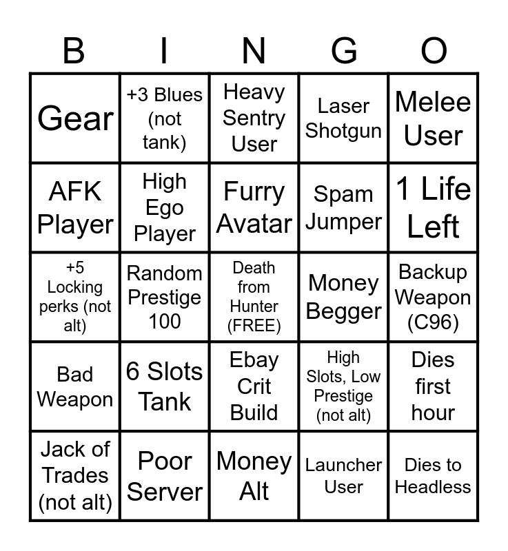 This bingo card has a free space and 24 words: 6 Slots Tank, Poor Server, Furry Avatar, Jack of Trades (not alt), Melee User, Gear, AFK Player, +3 Blues (not tank), Money Begger, Ebay Crit Build, Spam Jumper, +5 Locking perks (not alt), High Slots, Low Prestige (not alt), Dies first hour, High Ego Player, Launcher User, Backup Weapon (C96), Heavy Sentry User, 1 Life Left, Random Prestige 100, Dies to Headless, Bad Weapon, Laser Shotgun and Money Alt.