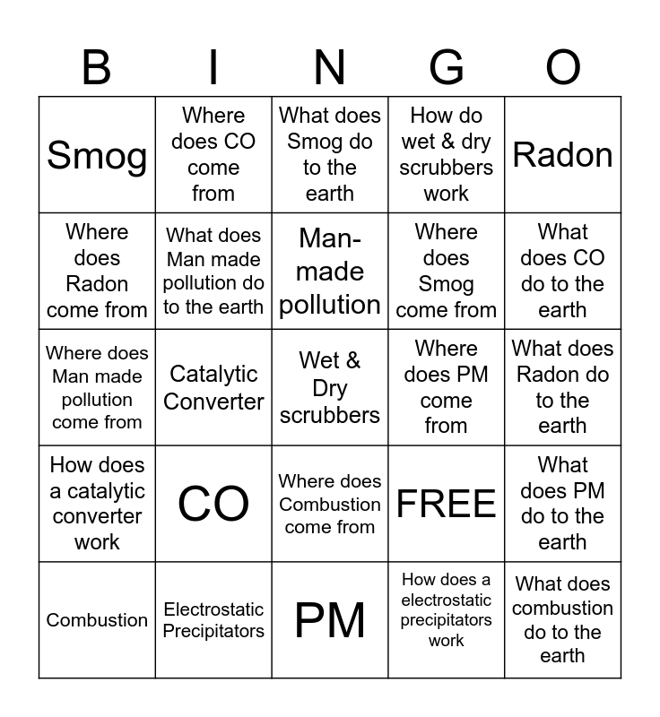 This bingo card has 25 words: CO, PM, Man-made pollution, Combustion, Radon, Smog, Where does Radon come from, Where does CO come from, Where does PM come from, Where does Combustion come from, Where does Smog come from, Where does Man made pollution come from, FREE, What does PM do to the earth, What does Man made pollution do to the earth, What does combustion do to the earth, What does Radon do to the earth, What does Smog do to the earth, What does CO do to the earth, Catalytic Converter, Wet & Dry scrubbers, Electrostatic Precipitators, How does a catalytic converter work, How do wet & dry scrubbers work and How does a electrostatic precipitators work.