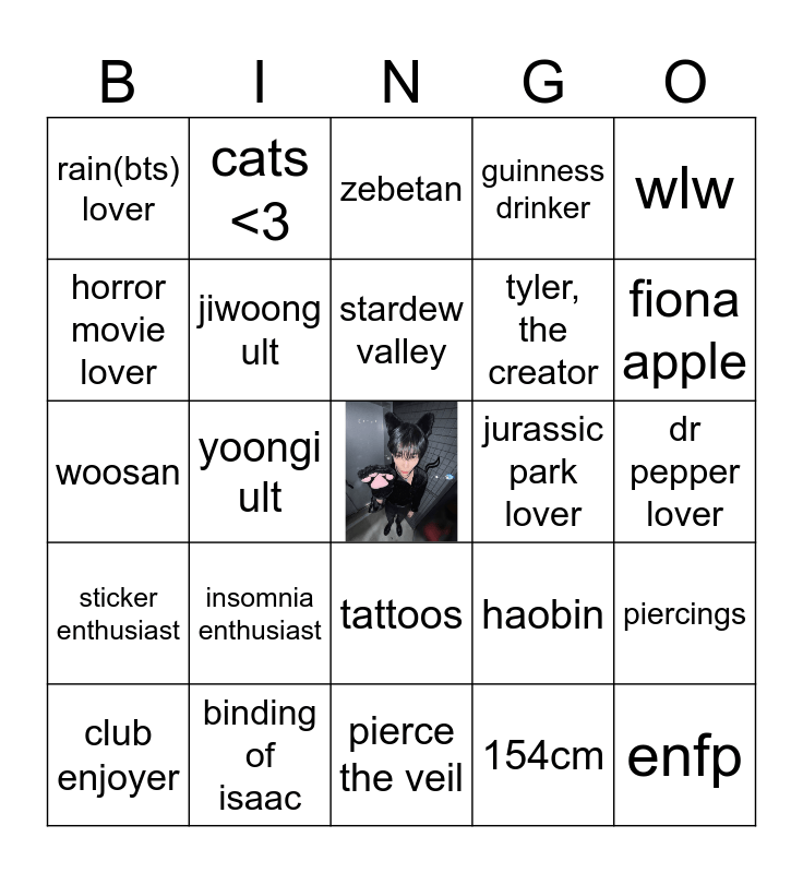 This bingo card has a free space and 24 words: insomnia enthusiast, binding of isaac, stardew valley, club enjoyer, wlw, rain(bts) lover, horror movie lover, cats <3, jurassic park lover, tattoos, tyler, the creator, woosan, haobin, piercings, jiwoong ult, 154cm, dr pepper lover, zebetan, fiona apple, yoongi ult, enfp, sticker enthusiast, guinness drinker and pierce the veil.