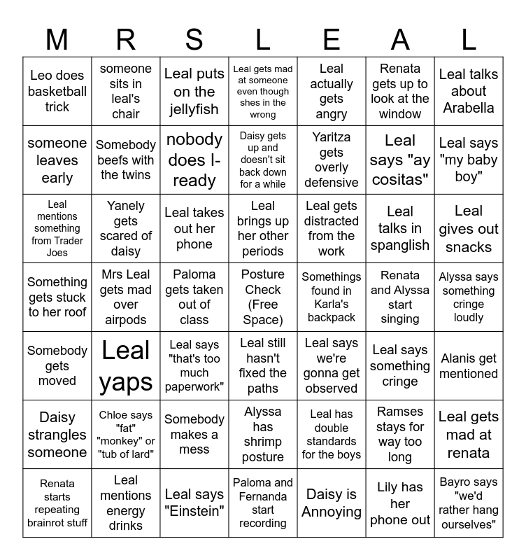 This bingo card has a free space and 55 words: Daisy is Annoying, Leal gives out snacks, Renata steals something, Leo does basketball trick, Mrs Leal gets mad over airpods, Chloe says "fat" "monkey" or "tub of lard", Leal talks about Arabella, Leal talks about her son, Somebody beefs with the twins, Somebody makes a mess, Leal gets mad at someone even though shes in the wrong, Alanis get mentioned, Alyssa says something cringe loudly, Renata and Alyssa start singing, Renata starts repeating brainrot stuff, Somebody gets moved, Leal actually gets angry, Yaritza gets overly defensive, Lily has her phone out, Leal says "ay cositas", Leal says "my baby boy", Leal yaps, Leal gets distracted from the work, Leal puts on the jellyfish, nobody does the work, someone leaves early, Paloma gets taken out of class, Leal talks about her vacation plans, Leal mentions something from Trader Joes, Leal talks in spanglish, The class gets quiet out of nowhere, Leal says something cringe, Leal gets mad at renata, Leal mentions energy drinks, Renata gets up to look at the window, Daisy gets up and doesn't sit back down for a while, Daisy strangles someone, Yanely gets scared of daisy, Bayro says "we'd rather hang ourselves", Leal says "that's too much paperwork", someone sits in leal's chair, Alyssa has shrimp posture, Leal has double standards for the boys, Leal gets mad at Thomas, Leal takes out her phone, Something gets stuck to her roof, Leal says "Einstein", Leal says we're gonna get observed, Somethings found in Karla's backpack, nobody does I-ready, Leal still hasn't fixed the paths, Ramses stays for way too long, Paloma and Fernanda start recording, Leal brings up her other periods and Leal leaves class.