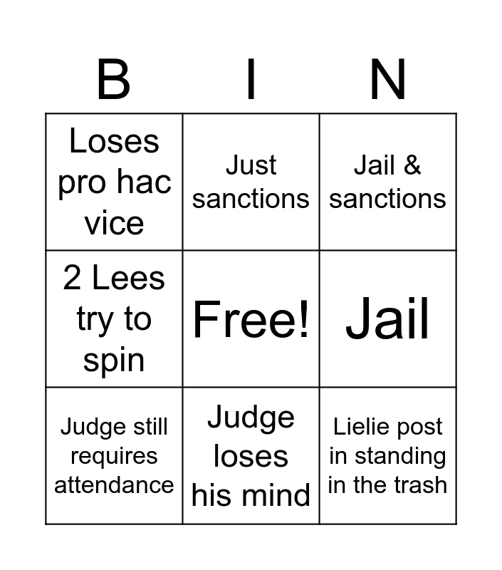 This bingo card has a free space and 8 words: Jail, Jail & sanctions, Just sanctions, Judge still requires attendance, Loses pro hac vice, Lielie post in standing in the trash, 2 Lees try to spin and Judge loses his mind.