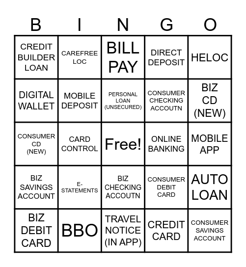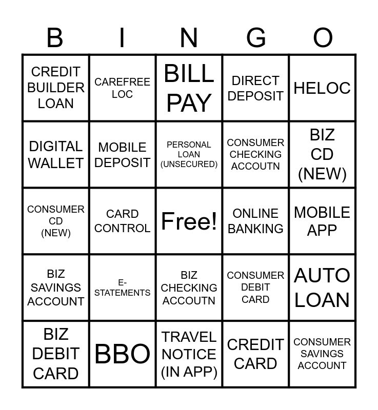 This bingo card has a free space and 24 words: E-STATEMENTS, BBO, PERSONAL LOAN (UNSECURED), BIZ DEBIT CARD, HELOC, CREDIT BUILDER LOAN, DIGITAL WALLET, CAREFREE LOC, ONLINE BANKING, BIZ CHECKING ACCOUTN, CONSUMER CHECKING ACCOUTN, CONSUMER CD (NEW), CONSUMER DEBIT CARD, AUTO LOAN, MOBILE DEPOSIT, CREDIT CARD, MOBILE APP, BILL PAY, BIZ CD (NEW), CARD CONTROL, CONSUMER SAVINGS ACCOUNT, BIZ SAVINGS ACCOUNT, DIRECT DEPOSIT and TRAVEL NOTICE (IN APP).