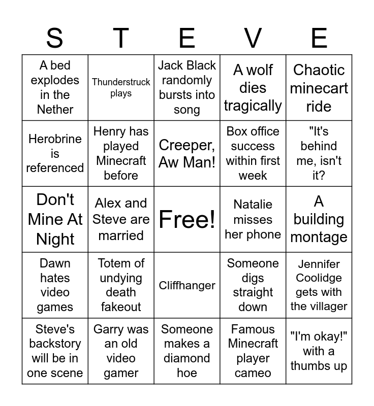 This bingo card has a free space and 24 words: Totem of undying death fakeout, Garry was an old video gamer, Creeper, Aw Man!, Steve's backstory will be in one scene, Chaotic minecart ride, A bed explodes in the Nether, Herobrine is referenced, Thunderstruck plays, Natalie misses her phone, Cliffhanger, Box office success within first week, Don't Mine At Night, Someone digs straight down, Jennifer Coolidge gets with the villager, Henry has played Minecraft before, Famous Minecraft player cameo, A building montage, Jack Black randomly bursts into song, "It's behind me, isn't it?, Alex and Steve are married, "I'm okay!" with a thumbs up, Dawn hates video games, A wolf dies tragically and Someone makes a diamond hoe.