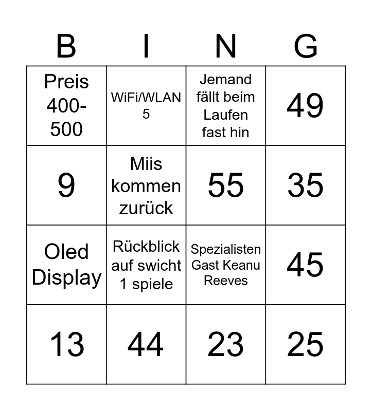 This bingo card has 39 words: 2, 22, 33, 55, 15, 30, 35, 60, 9, 25, 45, 49, 13, 23, 44, 56, Relaife cosplay, Preis 400-500, Kein rj45 Stecker in der Dock, Relase Oktober, Miis kommen zurück, Verschiede leistungs starke Modelle, Oled Display, Rückblick auf swicht 1 spiele, Aktivität für draußen/unterwegs werden gezeig, Steamspiel spielbar dank proton, Neues Merchandising wird gezeigt, Neur zelda teil angekündigt, Vorbesteller bouns ein amibio, WiFi/WLAN 5, Kompatibel mit mehr porgramm/Apps wie discord/Spotify, Moderator sagt lets go Wie mario, Jemand fällt beim Laufen fast hin, Es wird sich enschusiög für sie schlecht Leistung der swicht 1, Das home OS wird gezeigt, Kontroller wie ein maus benutzbar, Es wird ein extern Taster geben, Spezialisten Gast Keanu Reeves and Im hinter Grund ist ein mario plüstier zusehen.