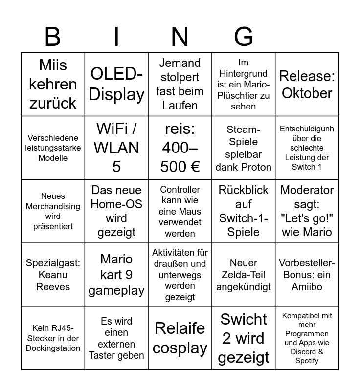 This bingo card has 25 words: Mario kart 9 gameplay, Relaife cosplay, reis: 400–500 €, Kein RJ45-Stecker in der Dockingstation, Release: Oktober, Miis kehren zurück, Verschiedene leistungsstarke Modelle, OLED-Display, Rückblick auf Switch-1-Spiele, Aktivitäten für draußen und unterwegs werden gezeigt, Steam-Spiele spielbar dank Proton, Neues Merchandising wird präsentiert, Neuer Zelda-Teil angekündigt, Vorbesteller-Bonus: ein Amiibo, WiFi / WLAN 5, Kompatibel mit mehr Programmen und Apps wie Discord & Spotify, Moderator sagt: "Let's go!" wie Mario, Jemand stolpert fast beim Laufen, Entschuldigunh über die schlechte Leistung der Switch 1, Das neue Home-OS wird gezeigt, Controller kann wie eine Maus verwendet werden, Es wird einen externen Taster geben, Spezialgast: Keanu Reeves, Im Hintergrund ist ein Mario-Plüschtier zu sehen and Swicht 2 wird gezeigt.