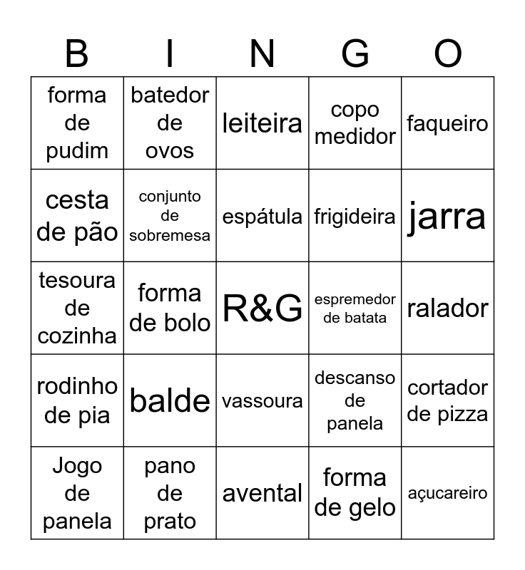 This bingo card has a free space and 51 words: abridor de latas, açucareiro, assadeira, avental, balde, bandeja, batedor de ovos, cabide, cesta de pão, concha, conjunto de sobremesa, copo medidor, cortador de pizza, descanso de panela, escorredor de arroz, escorredor de massas, espátula, espremedor de batata, faca de pão, faqueiro, forma de bolo, forma de gelo, forma de pudim, frigideira, funil, garrafa térmica, jarra, jogo americano, Jogo de panela, leiteira, livro de receitas, lixeira, luva térmica, pá de lixo, pano de chão, pano de prato, pegador de salada, pincel culinário, porta temperos, pote de mantimento, ralador, rodinho de pia, rodo, rolo de macarrão, saleiro, tábua de carne, tesoura de cozinha, tigelas, vaso de flores, vassoura and xícara.