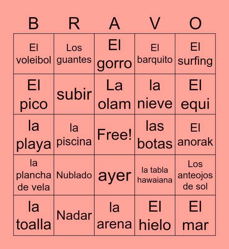 This bingo card has a free space and 24 words: Nublado, Nadar, La olam, la toalla, El surfing, El voleibol, El pico, Los guantes, las botas, ayer, la nieve, la playa, la tabla hawaiana, Los anteojos de sol, subir, El hielo, El anorak, El gorro, El equi, la piscina, El mar, la plancha de vela, El barquito and la arena.