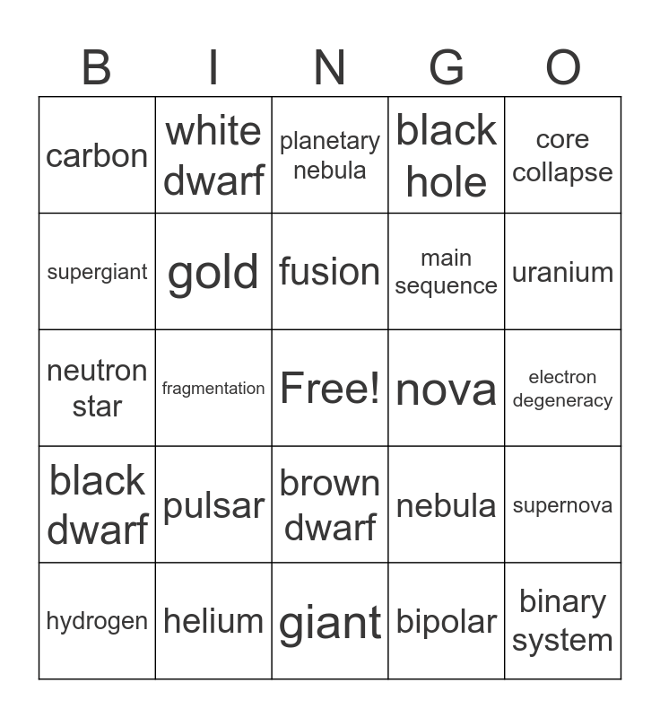This bingo card has a free space and 27 words: nebula, protostar, main sequence, giant, supergiant, planetary nebula, white dwarf, black dwarf, nova, supernova, neutron star, black hole, hydrogen, helium, uranium, iron, gold, fusion, pulsar, carbon, electron degeneracy, bipolar, fragmentation, binary system, brown dwarf, core collapse and carbon detonation.
