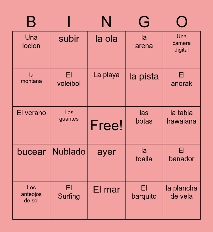 This bingo card has a free space and 24 words: Nublado, El Surfing, La playa, Los anteojos de sol, Una camera digital, Una locion, la montana, subir, las botas, ayer, la pista, El verano, la toalla, El banador, El voleibol, El barquito, la tabla hawaiana, la ola, El anorak, Los guantes, la plancha de vela, bucear, la arena and El mar.