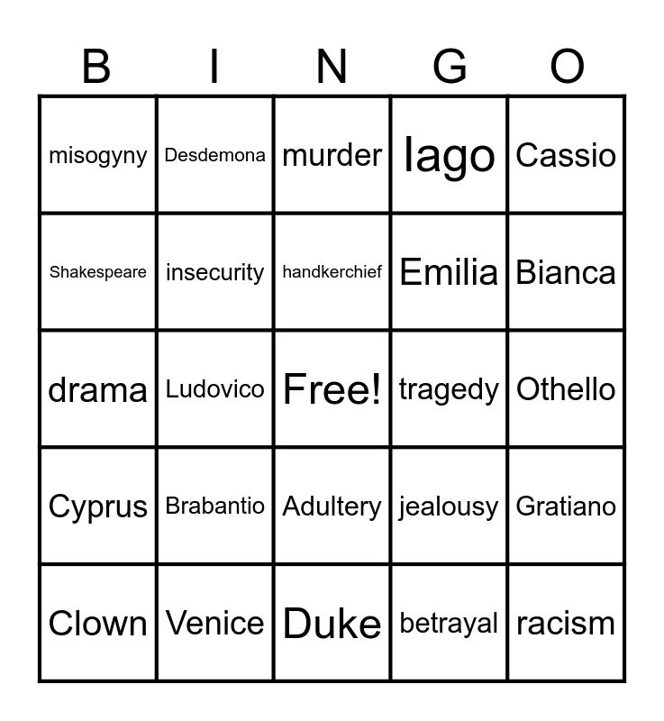 This bingo card has a free space and 24 words: Brabantio, Venice, handkerchief, Clown, Cassio, misogyny, Shakespeare, Desdemona, tragedy, Adultery, Emilia, drama, jealousy, Gratiano, insecurity, betrayal, Othello, murder, Bianca, Ludovico, racism, Cyprus, Iago and Duke.